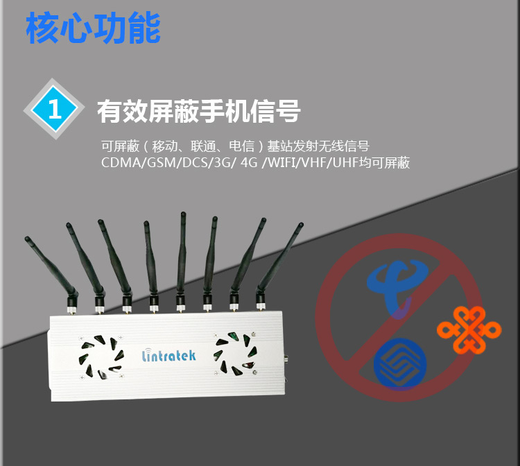 手機信號屏蔽器在工作過程中以一定的速度從前向信道的低端頻率向高端掃描,發射功率在數瓦量級,屏蔽范圍可調節,一般為幾十米,手機接收信號中形成亂碼干擾,使得手機不能檢測出從基站發出的正常數據,手機不能與基站建立聯接。表現為搜索網絡、手機無信號、無服務系統等現象。